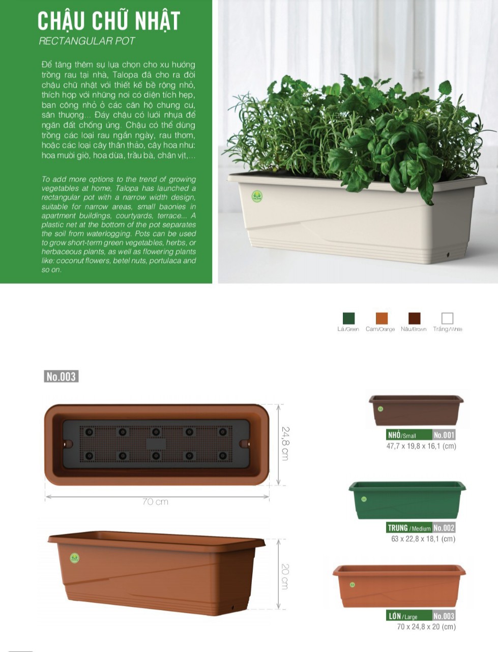 Chậu Hoa Chữ Nhật mang vườn rau xanh đến ngôi nhà bạn cấu tạo của cây trồng rau chữ nhật tam pha gồm hai tầng được ngăn cách bởi một tấm lưới nhựa nên có ưu điểm là lưu và dữ trữ được một lượng nước cấp nhất định ở phía dưới hệ thống thoát nước được đặt hai bên thành khi thay vì dưới đáy khi điều này giúp giữ đất trồng một độ ẩm cần thiết và dinh dưỡng giúp rau trồng phát triển xanh tươi .