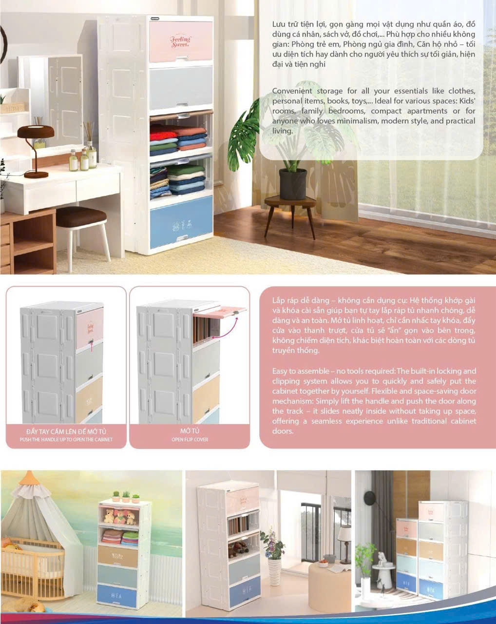 ✔ Mở tủ linh hoạt – cửa nắp gập, dấu vào bên trong • Chỉ cần nhấc tay cầm lên là mở được • Nắp tủ trượt ẩn vào bên trong giúp không chiếm diện tích, siêu tiện
