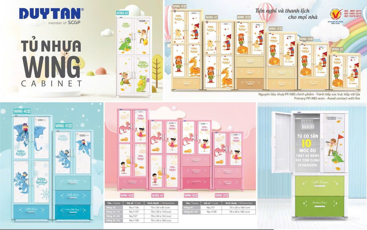 Wing là dòng sản phẩm tủ nhựa Cao cấp duy nhất có thể treo đồ của nhựa duy tân có kích thước lớn nhất của Duy Tân, mặt tủ có ốp Meca và có khóa ở cánh tủ trên.